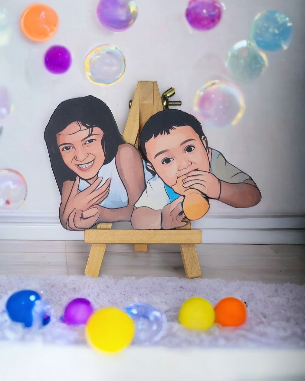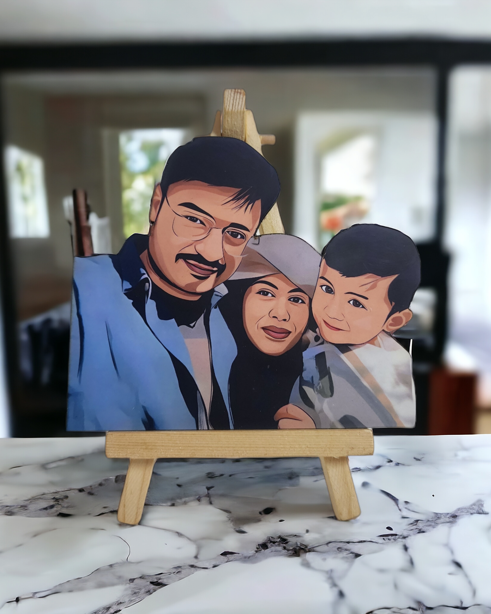 A hand-drawn caricature art wooden cutout is a playful, exaggerated representation of a person, highlighting distinctive features in a whimsical style. These colorful, unique cutouts add a fun and personal touch, perfect for decorations, table tops, or gifts.